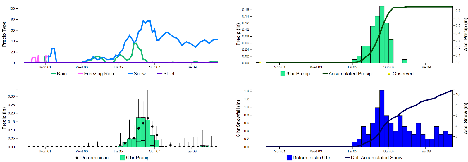 Also from the NBM 1D Viewer, precipitation at KSLC looks most probable after Friday, January 05, 2024. The chances for snow (under precipitation type) remain greater than rain or freezing rain and coincides with the timing of greater accumulated precipitation rates over next weekend. Given the falling temperatures, it seems safe to bet on snowfall with this setup. But we won't delve much further on precipitation at this time due to the uncertainty of the placement of incoming troughs that far out in time.